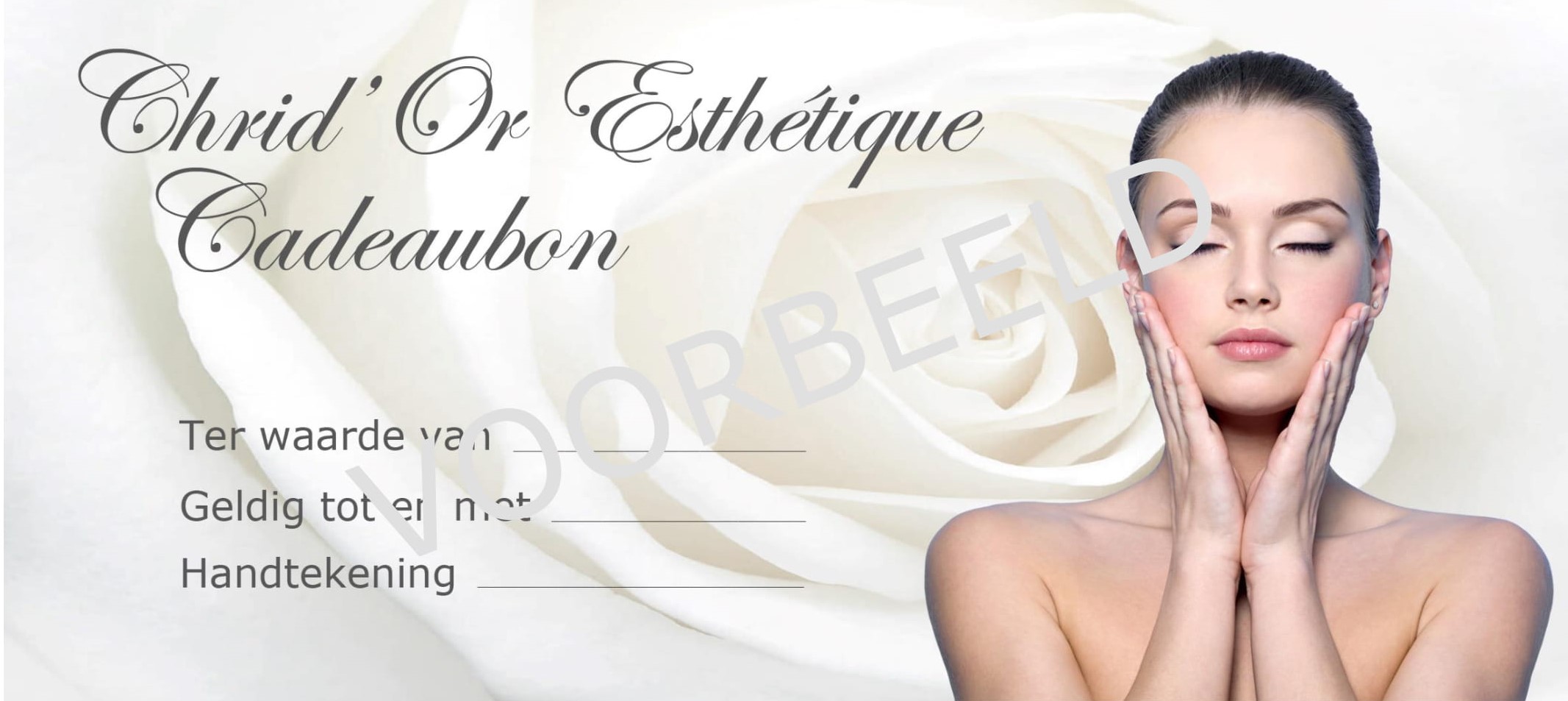 Verras iemand, of jezelf, met een cadeaubon van Chrid’Or Esthétique. Een mooi geschenk voor een verjaardag, feestdag of gewoon om iemand extra te verwennen. De Chrid’Or Esthétique cadeaubonnen zijn verkrijgbaar vanaf € 15,00, zijn een jaar geldig en kunnen gebruikt worden voor zowel behandelingen als producten. De bon wordt voor u feestelijk verpakt, zodat het extra leuk geven is!